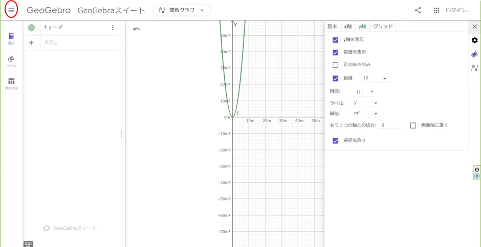 グラフの軸や目盛り等の詳細設定は設定ボタン(下図の丸で囲ったボタン)から変更できます. x軸やy軸の単位やラベルの設定ができます.