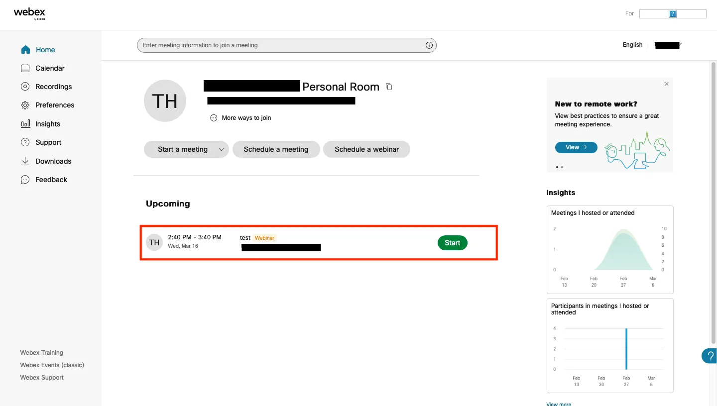 Webex Webinars, the topic of this article, should not be confused with Webex Events (classic), which you can set up by clicking “Webex Events (classic)” on the bottom-left corner of the home screen. They are configured differently, have different available functions, etc.